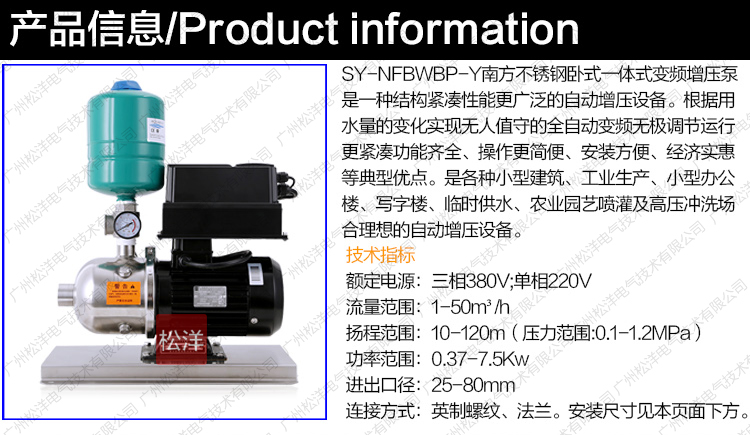 SY-NFBWBP-Y南方不銹鋼臥式一體式變頻增壓泵是一種 結構緊湊性能更廣泛的自動增壓設備。根據用水量的變化 實現(xiàn)無人值守的全自動變頻無極調節(jié)運行。更緊湊功能齊 全、操作簡便、安裝方便、經濟實惠等典型優(yōu)點。是各種 小型建筑、工業(yè)生產、小型辦公樓、寫字樓、臨時供水、 農業(yè)園藝噴灌及高壓沖洗場合理想的自動增加設備。
